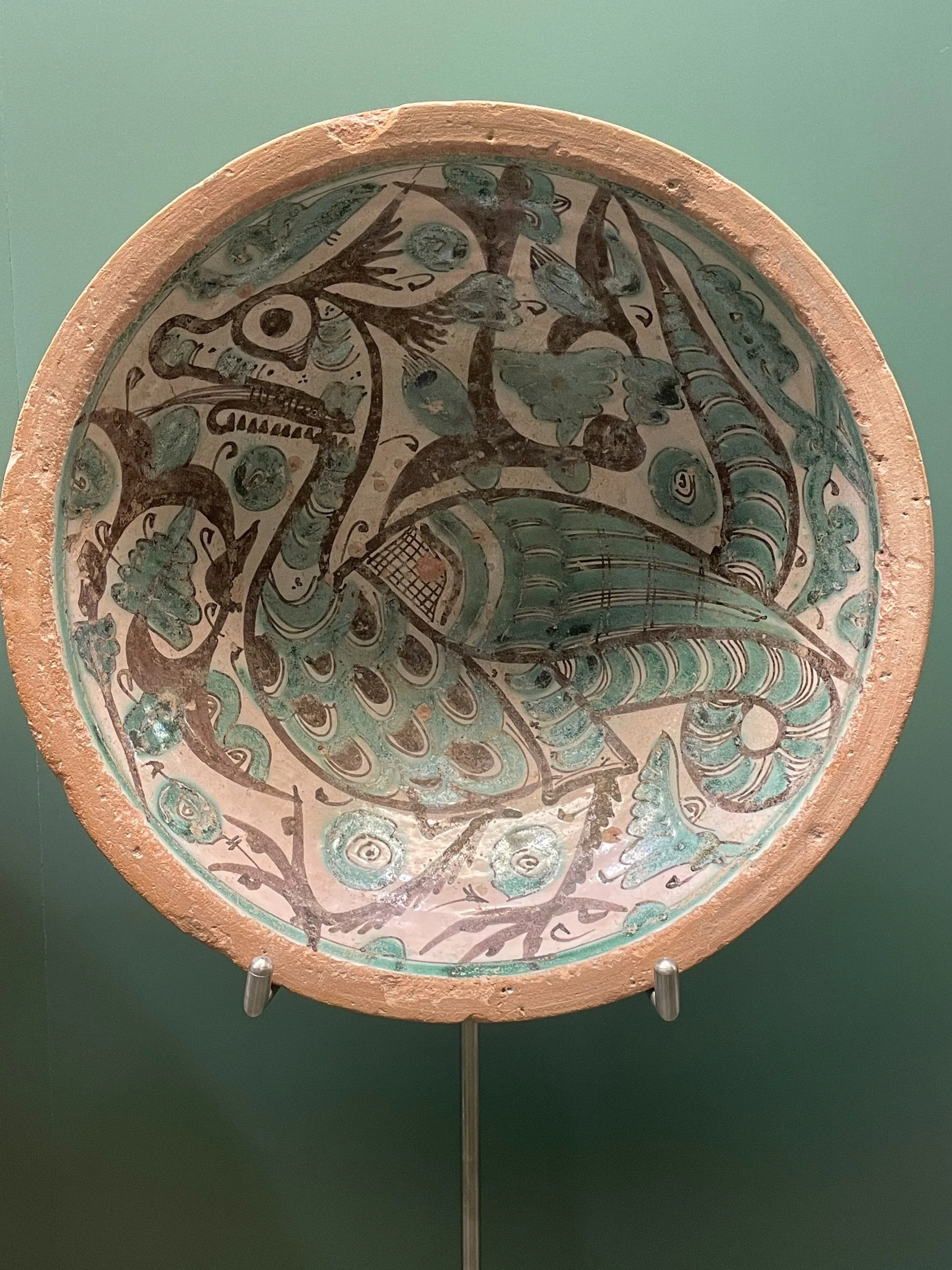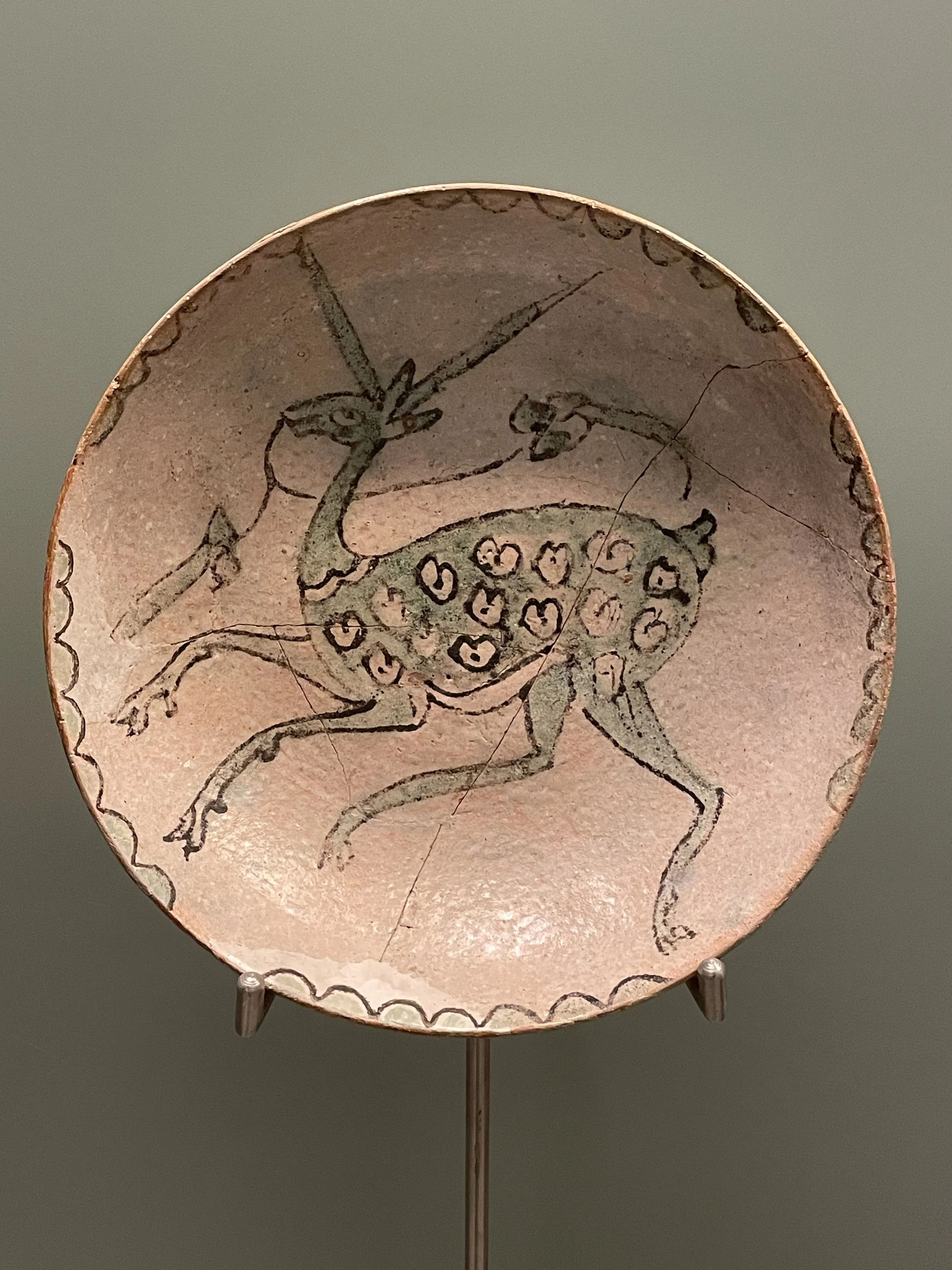 At the same moment in the 9th century these potters developed their second great contribution to ceramic history: lusterware. In the realm of medieval luxury goods, a metal object was the pinnacle. However, if you can’t afford gold or silver, something that looks like it is the next best thing. Glass blowers had already found a technique that added a shiny surface to their vessels. Using a similar process, potters combined metal-based paints with a special firing process and produced a golden shimmer on the surface of their tin-glazed earthenware.
